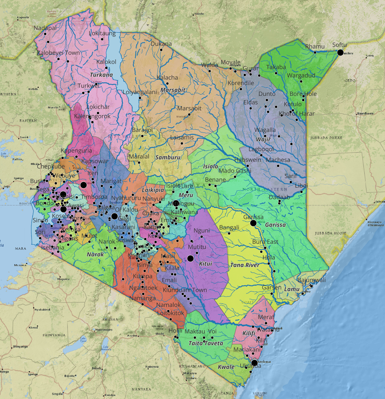 The map on this page shows the projects financed by the Embassy of the Netherlands in Nairobi. The number of projects per ward is shown with an orange shading, and the coloured dots represent the theme of each project. A summary of projects is displayed in the table below the map.